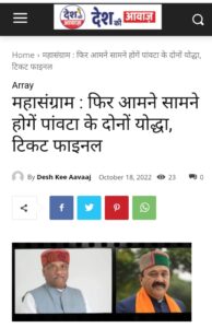 जिला सिरमौर के पांवटा विधानसभा क्षेत्र से पूर्व विधायक चौधरी किरनेश जंग को आखिरकार टिकट मिल गया है। 18 अक्टूबर को देश की आवाज न्यूज पोर्टल ने पहले ही बता दिया था। कि इस बार भी दोनों चौधरी के बीच जंग होनी निश्चित है। बाकी उम्मीदवारों को अपनी जमानत बचाने के लाले पड़ सकते है।