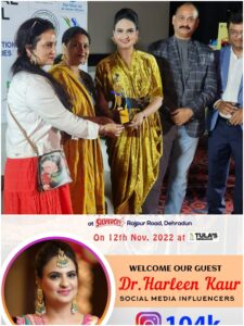 सिरमौर के पांवटा साहिब की टेरो कार्ड रीडर और हीलिंग थेरेपिस्ट एवं बेकरी एंड केक ट्रेनर डाॅ हरलीन कौर को अब उत्तराखंड के देहरादून में आयोजित फिल्म फेस्टिवल में Influencer in social media award मिला है।