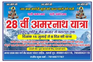 अगर आप जम्मू कश्मीर राज्य में स्थित अमरनाथ यात्रा पर जाना चाहते है तो तैयार हो जाए। ये यात्रा 8 दिन की हैं। पांवटा साहिब से बस के माध्यम से यात्रा शुरू होगी।
