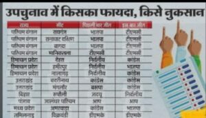 इसके अलावा उत्तराखंड में कांग्रेस ने जो 2 सीट जीती है। इसमें एक सीट बद्रीनाथ पहले ही कांग्रेस के पास ही थी। और मगलौर बीएसपी पास के थी। अब हिमाचल में जो 2 सीट कांग्रेस जीती थी। उन सीट पर पहले निर्दलीय जीते थे। बेशक कांग्रेस ने टोटल 4 सीट जीती है। और बीजेपी ने दो सीट हिमाचल की एक हमीरपुर की एक और मध्य प्रदेश एक जीती है।