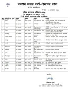 सिकंदर बताया की जिला कार्यशाला का शेड्यूल कुछ इस प्रकार रहेगा। 13 को धर्मशाला और सिरमौर में, 14 अक्टूबर को जिला चंबा, नूपुर,पालमपुर, हमीरपुर, महासू और शिमला की आयोजित कार्यशाला में मुख्यवक्ता राज्यसभा सांसद इंदु गोस्वामी, पूर्व विधानसभा अध्यक्ष विपिन परमार, प्रदेश सचिव सुमित शर्मा, विधायक त्रिलोक जमवाल, प्रदेश सचिव संजय ठाकुर और पूर्व मंत्री डॉ राजीव सैजल उपस्थित रहेंगे।